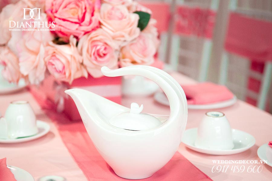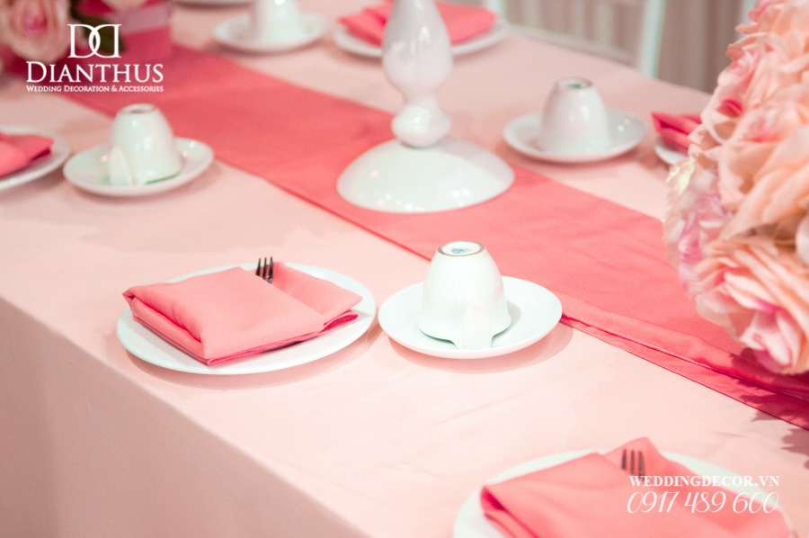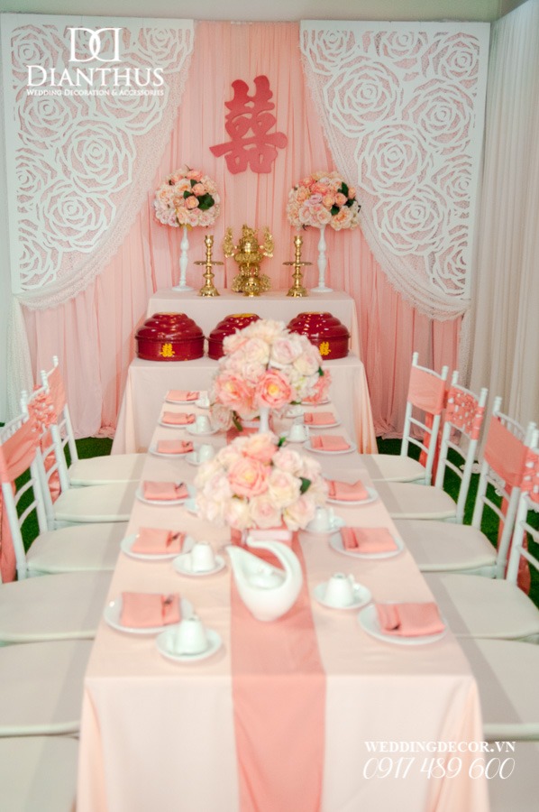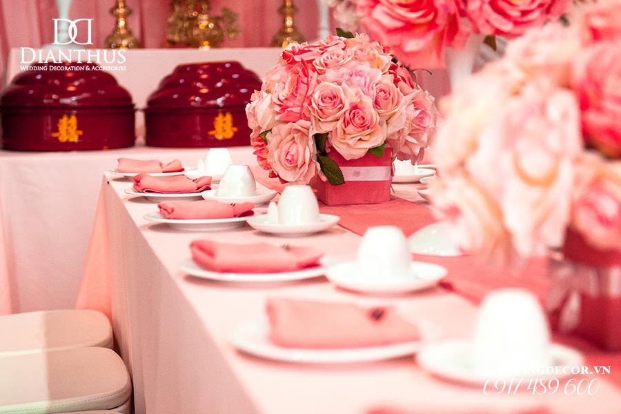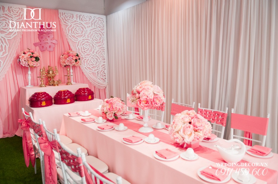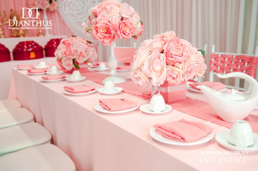 - Màu sắc của gói sẽ được phối tone sur tone với các các hạng mục như là: phông màn, nơ ghế, khăn bàn, tem chai nước suối, và hoa trang trí.