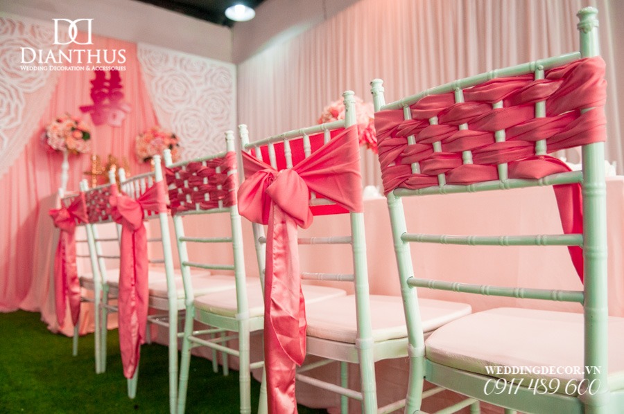 - 12 Ghế dựa/Ghế Tiffany thắt nơ & kèm cụm hoa theo tông màu.