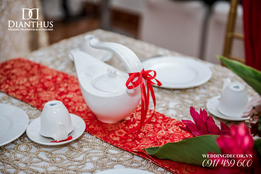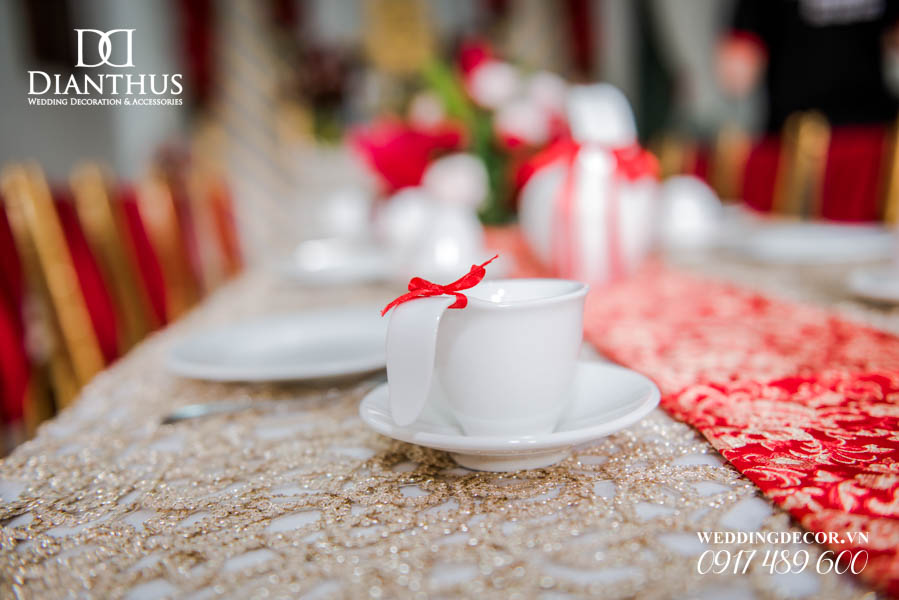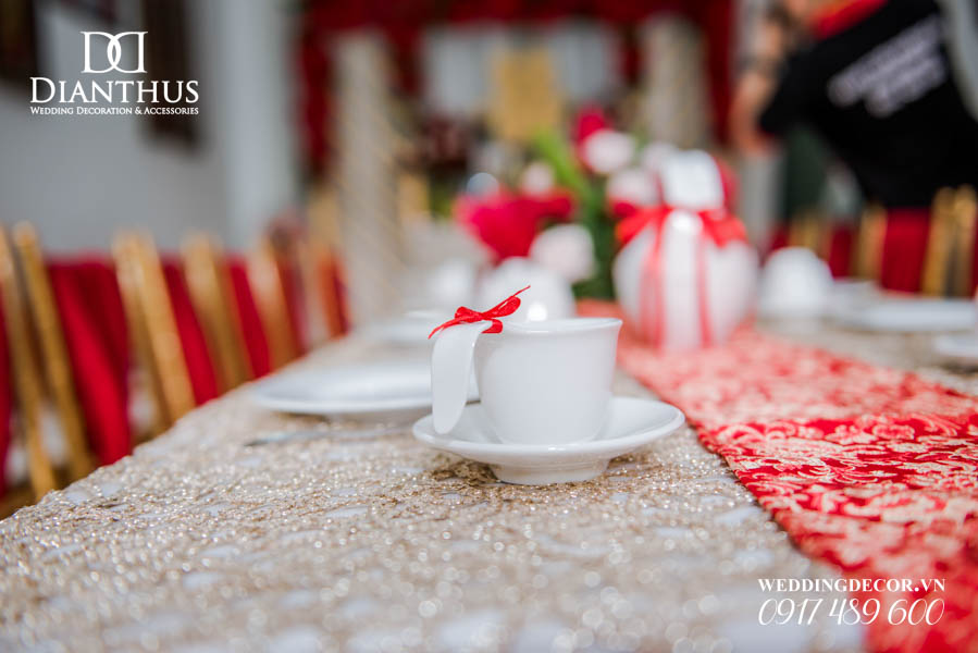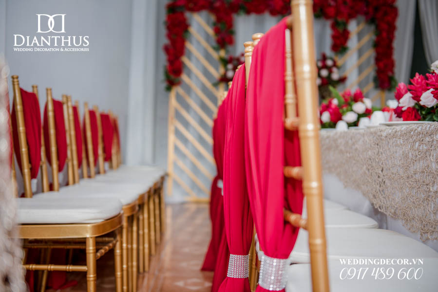 - Màu sắc của gói sẽ được phối tone sur tone với các các hạng mục như là: phông màn, nơ ghế, khăn bàn, tem chai nước suối, và hoa trang trí.