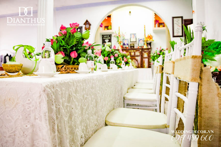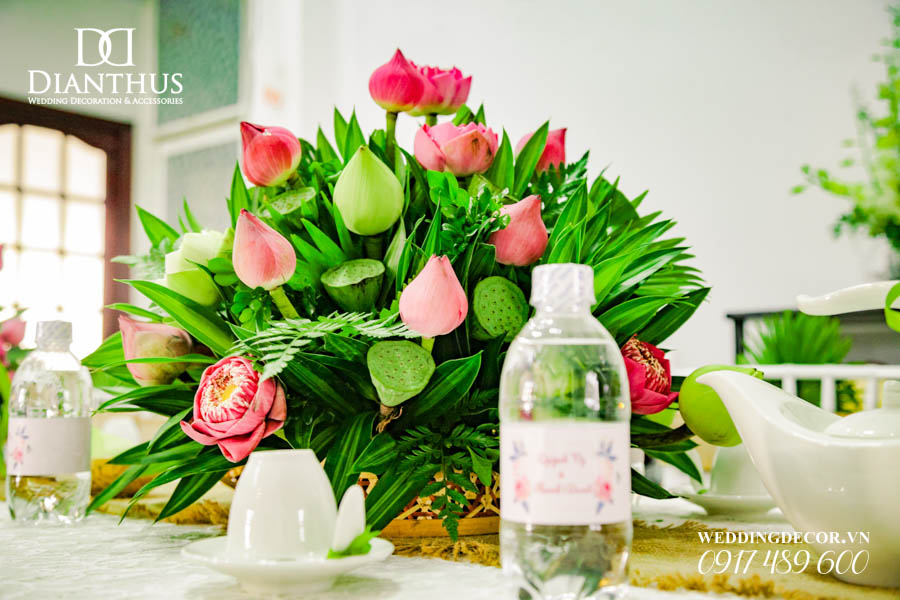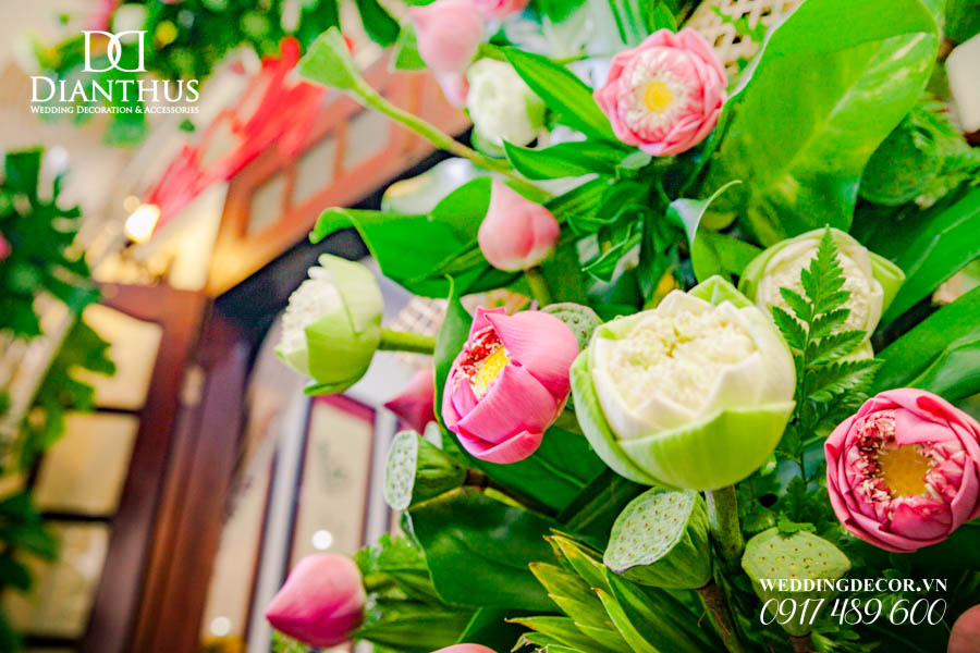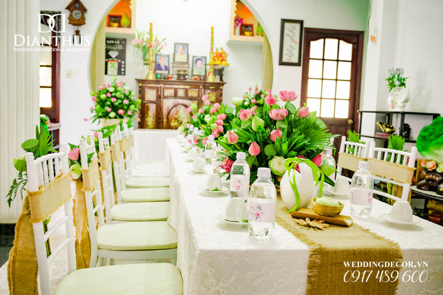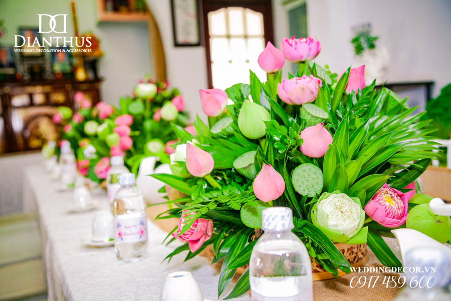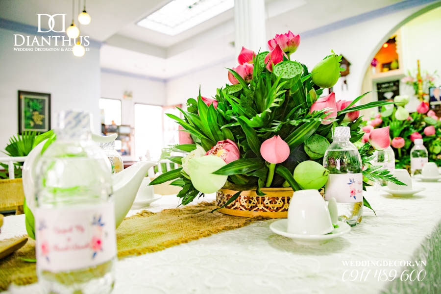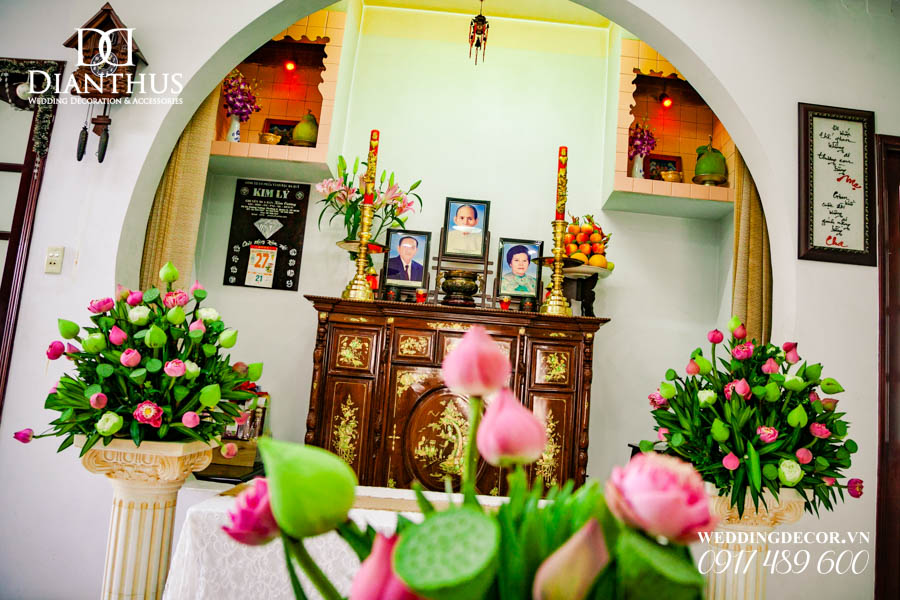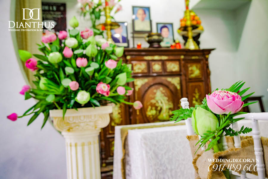 Dịch vụ Trang Trí Nhà Lễ Gia Tiên Hoa Tươi – Gói Anita Lotus đã được sử dụng trong Lễ Vu Quy của cặp đôi Quỳnh Vy & Thanh Danh. Ngoài ra, Quý Khách có thể xem thêm nhiều dự án trang trí khác do Dianthus thực hiện tại Menu PORTFOLIO