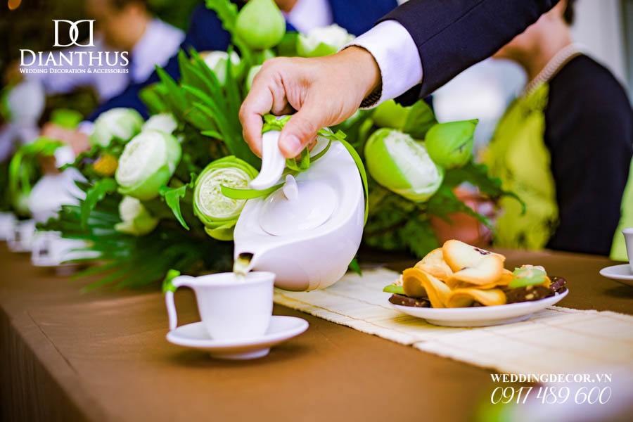 - Màu sắc của gói sẽ được phối tone sur tone với các các hạng mục như là: phông màn, nơ ghế, khăn bàn, tem chai nước suối, và hoa trang trí.