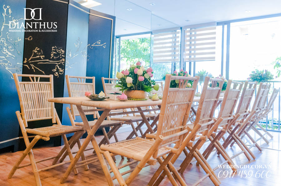- 12 Ghế dựa tre, thắt nơ kèm cụm hoa theo