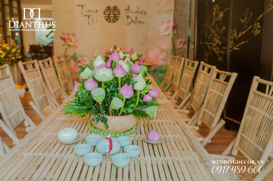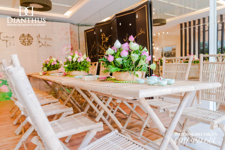 - Gói này đã bao gồm bộ bàn ghế bằng tre, chỉ phụ thu trong trường hợp phát sinh thêm ghế. Chi phí 1,200,000 VNĐ/gói/12 ghế.