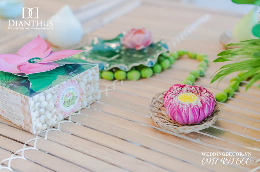 - Màu sắc của gói sẽ được phối tone sur tone với các các hạng mục như là: phông màn, nơ ghế, khăn bàn, tem chai nước suối, và hoa trang trí.