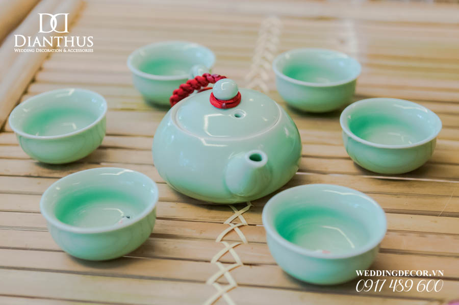 - Bộ ấm tách trà, dĩa lót ly sử dụng là loại gốm sứ Minh Long rất sang trọng.