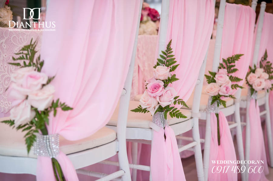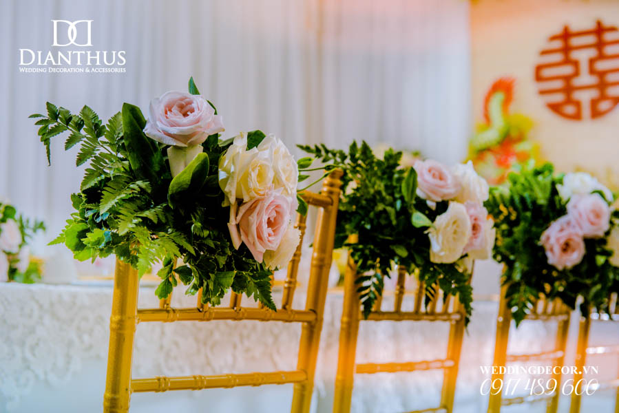 - 12 Ghế dựa/Ghế Tiffany thắt nơ & kèm cụm hoa theo tông màu.