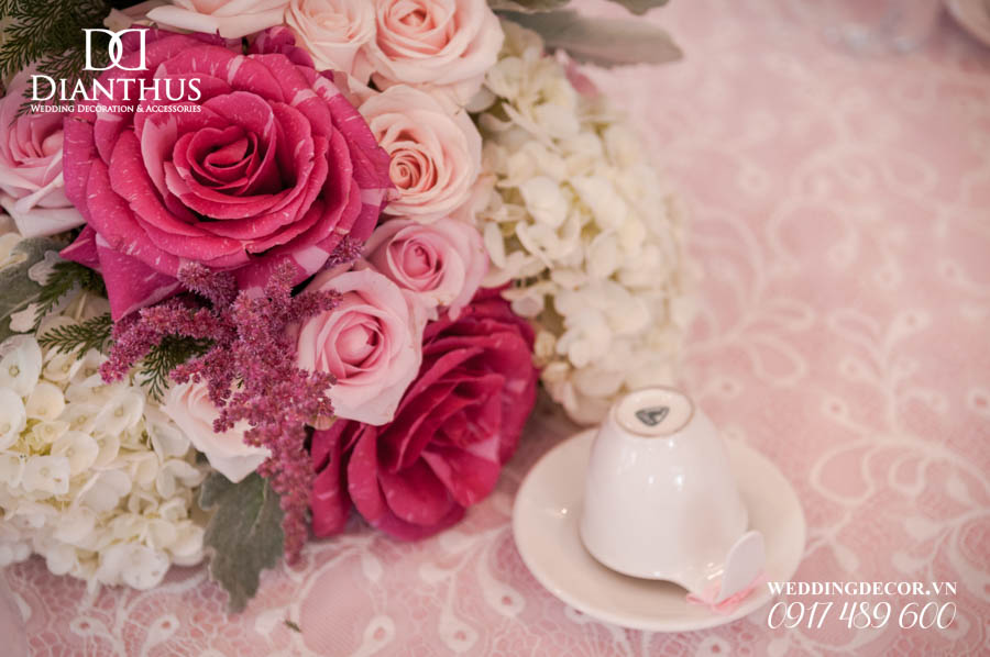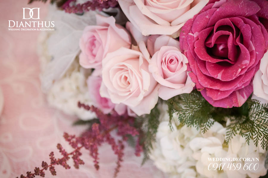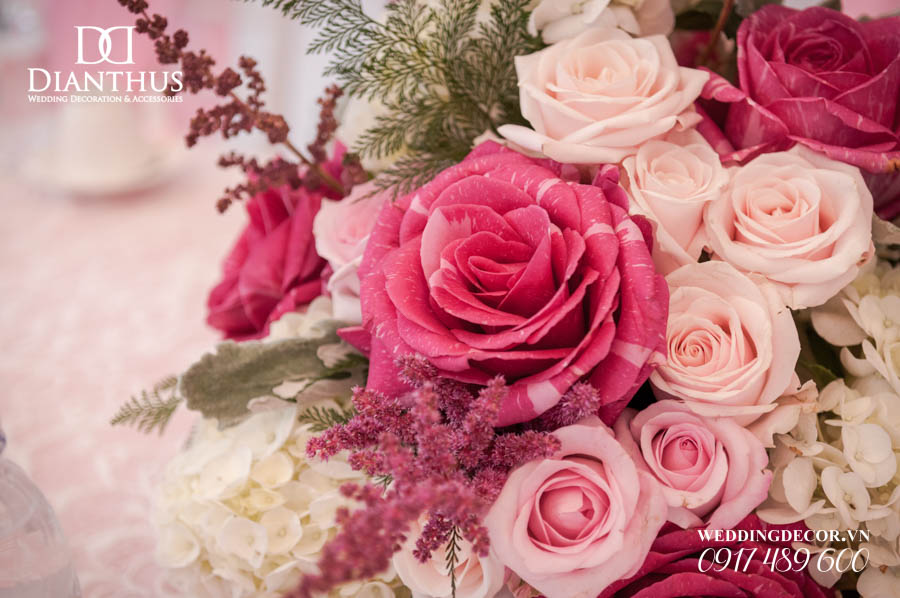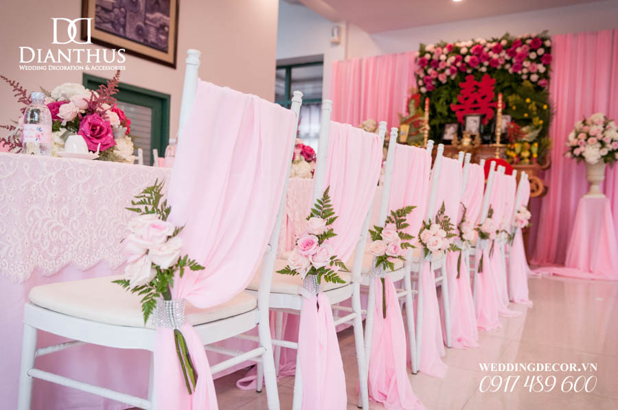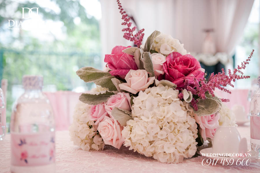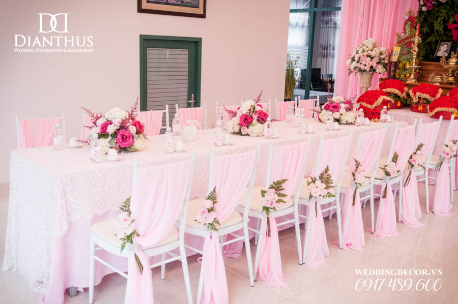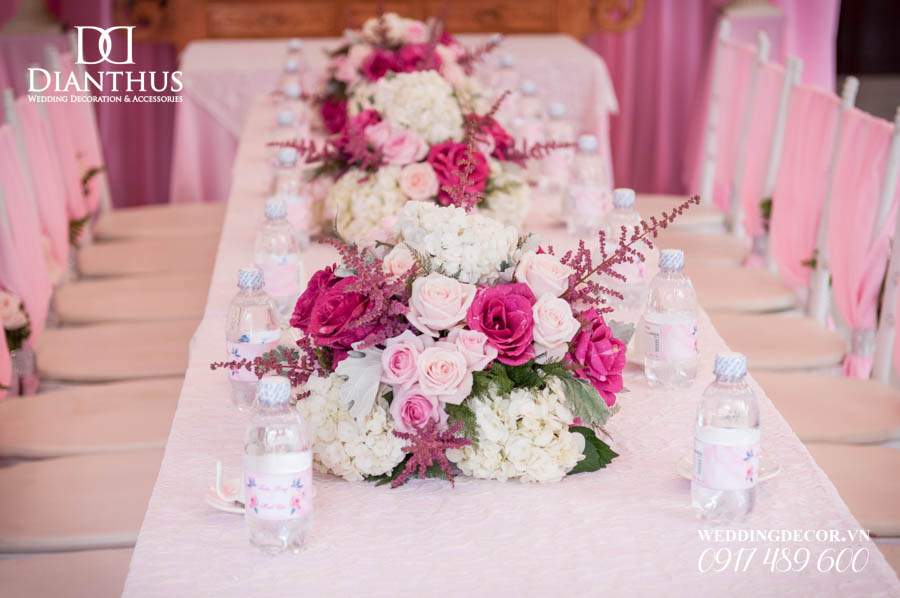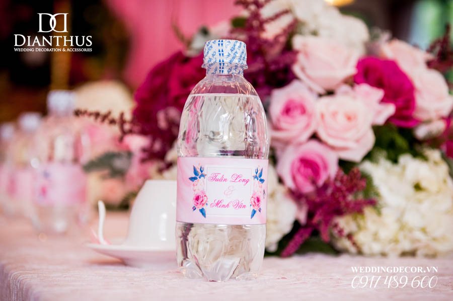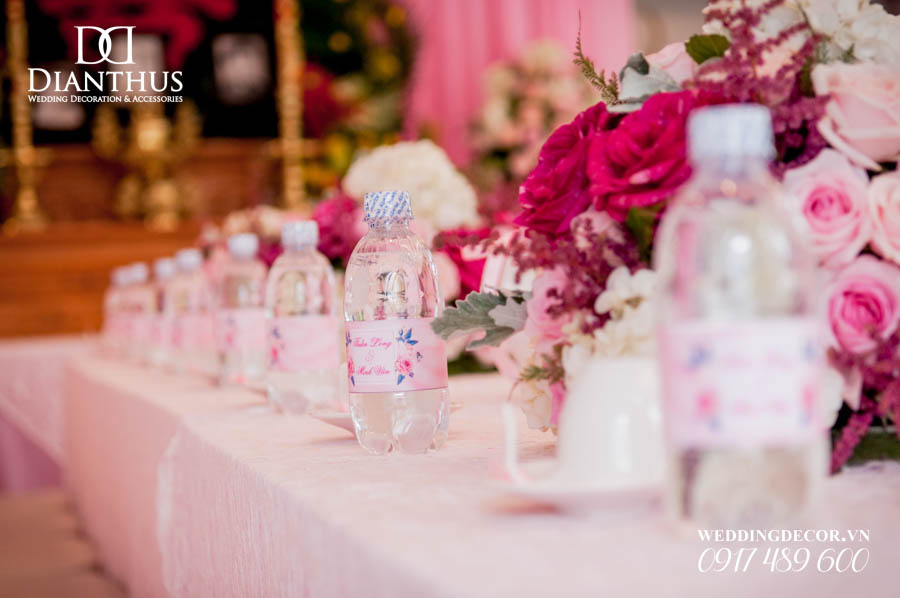 - Màu sắc của gói sẽ được phối tone sur tone với các các hạng mục như là: phông màn, nơ ghế, khăn bàn, tem chai nước suối, và hoa trang trí.