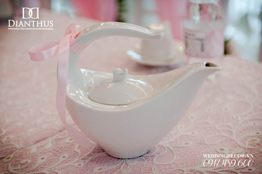 - Bộ ấm tách trà, dĩa lót ly sử dụng là loại gốm sứ Minh Long rất sang trọng.