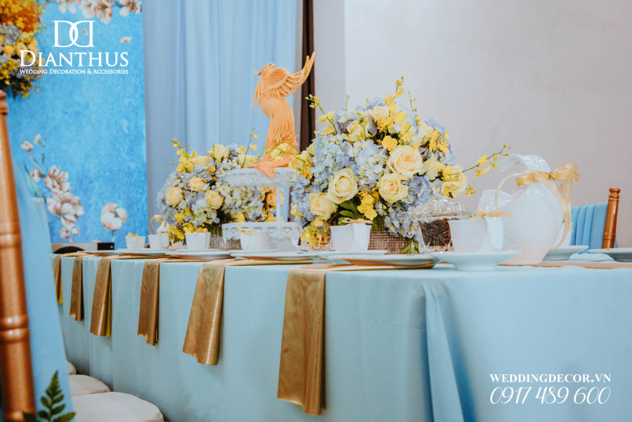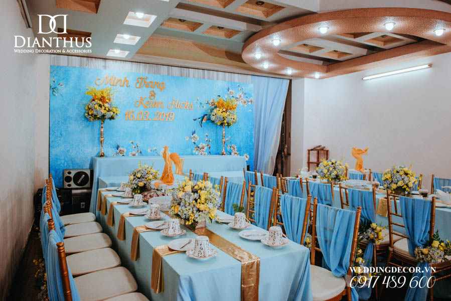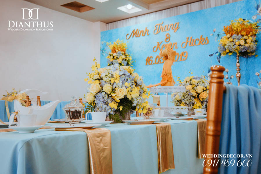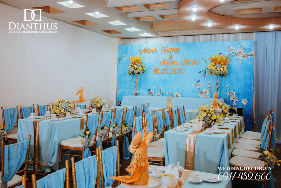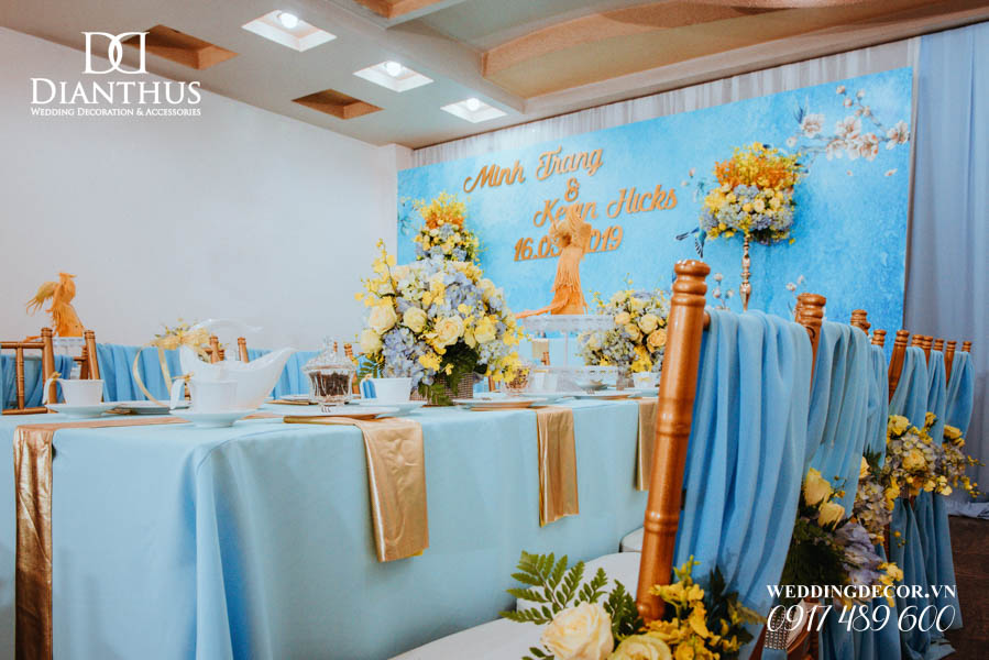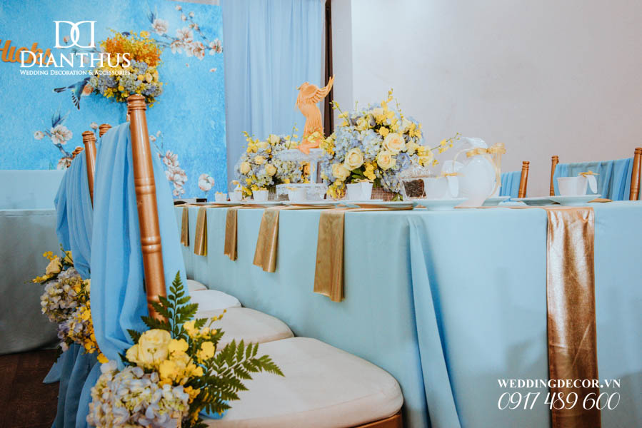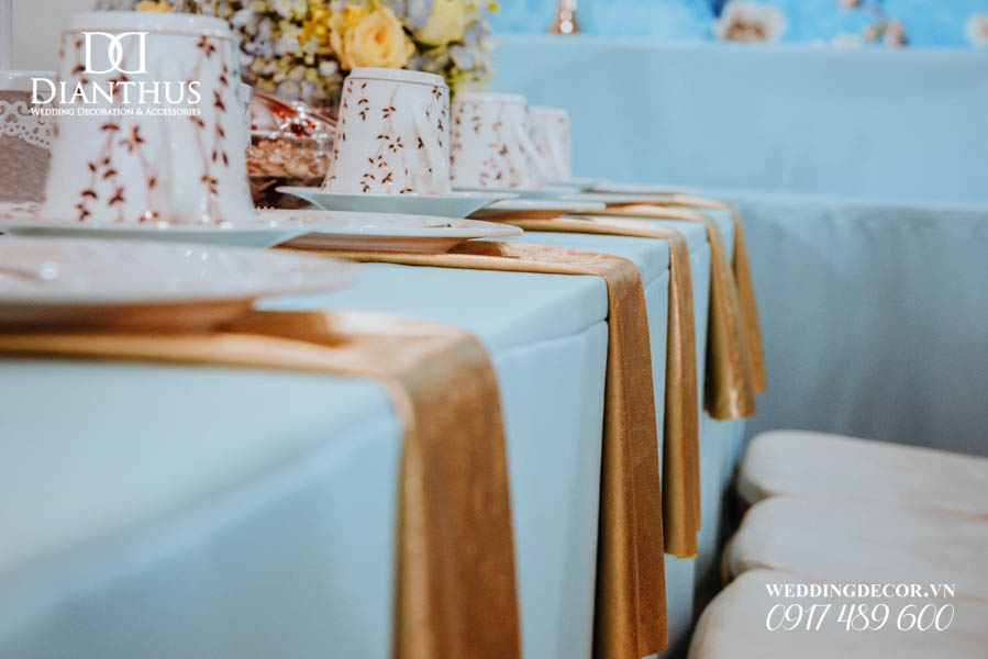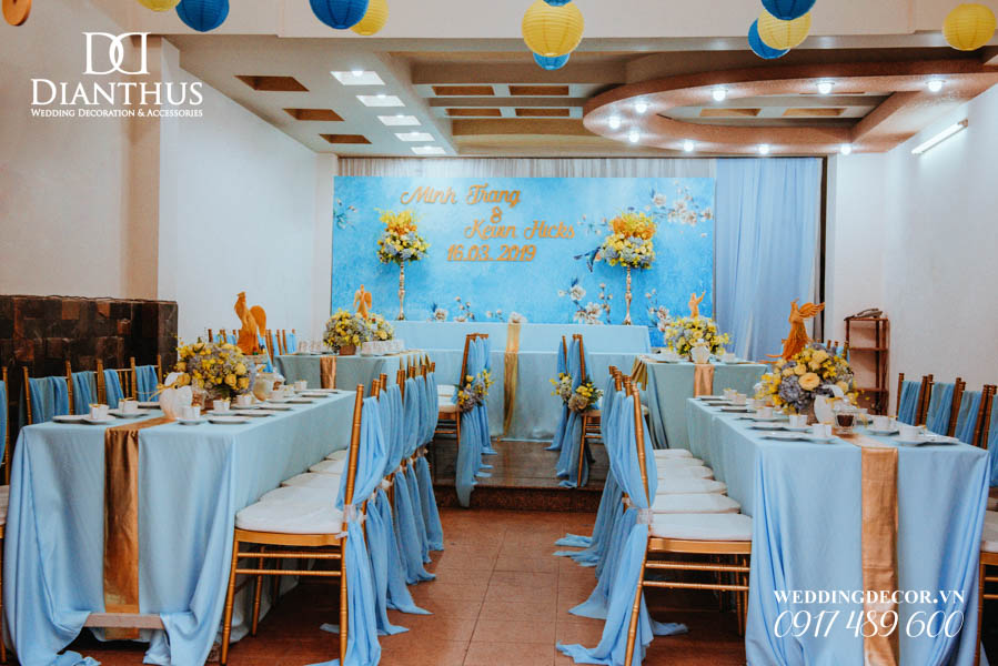 - Màu sắc của gói sẽ được phối tone sur tone với các các hạng mục như là: phông màn, nơ ghế, khăn bàn, tem chai nước suối, và hoa trang trí.