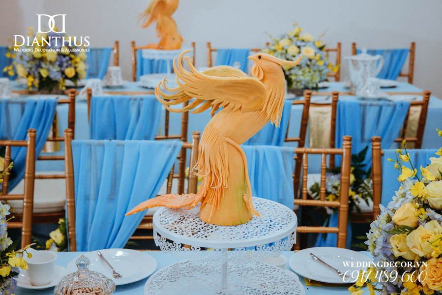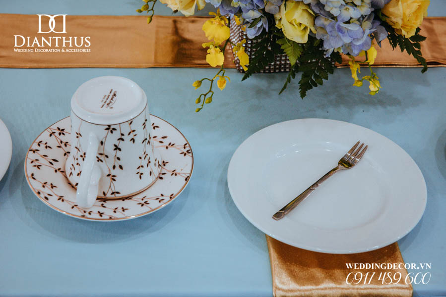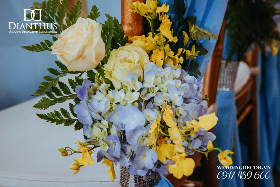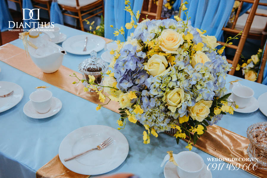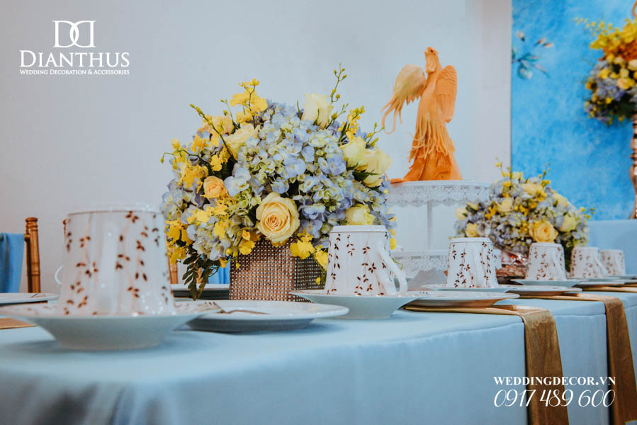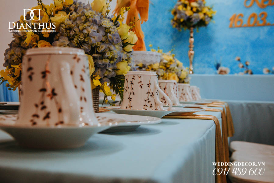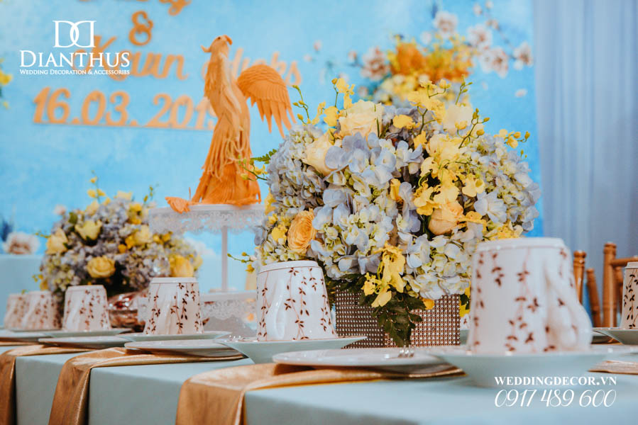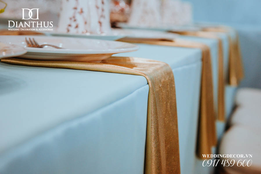- Màu sắc của gói sẽ được phối tone sur tone với các các hạng mục như là: phông màn, nơ ghế, khăn bàn, tem chai nước suối, và hoa trang trí.