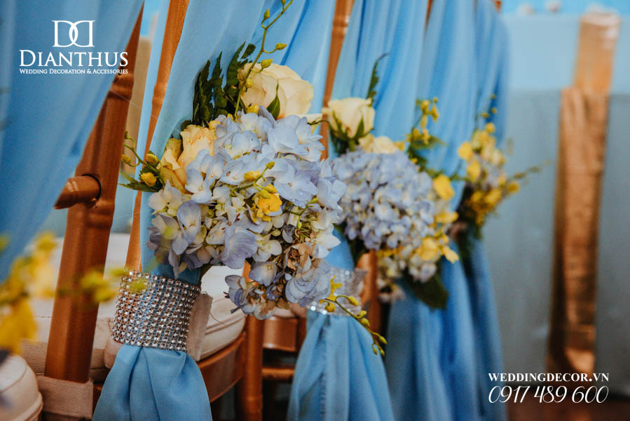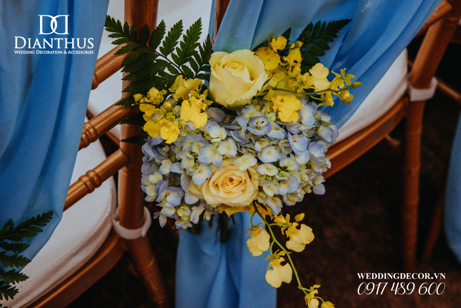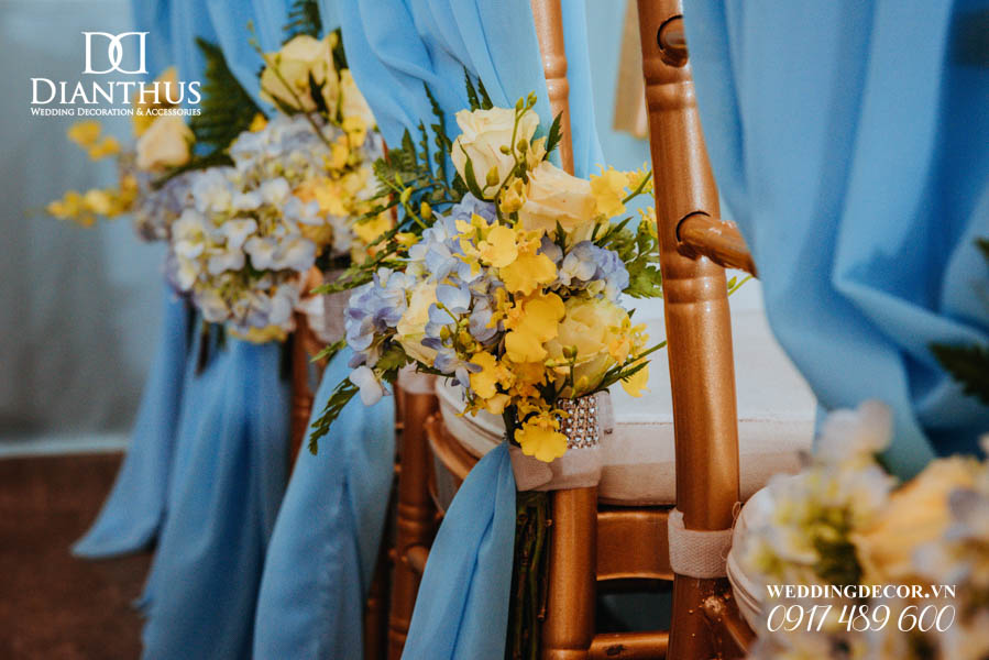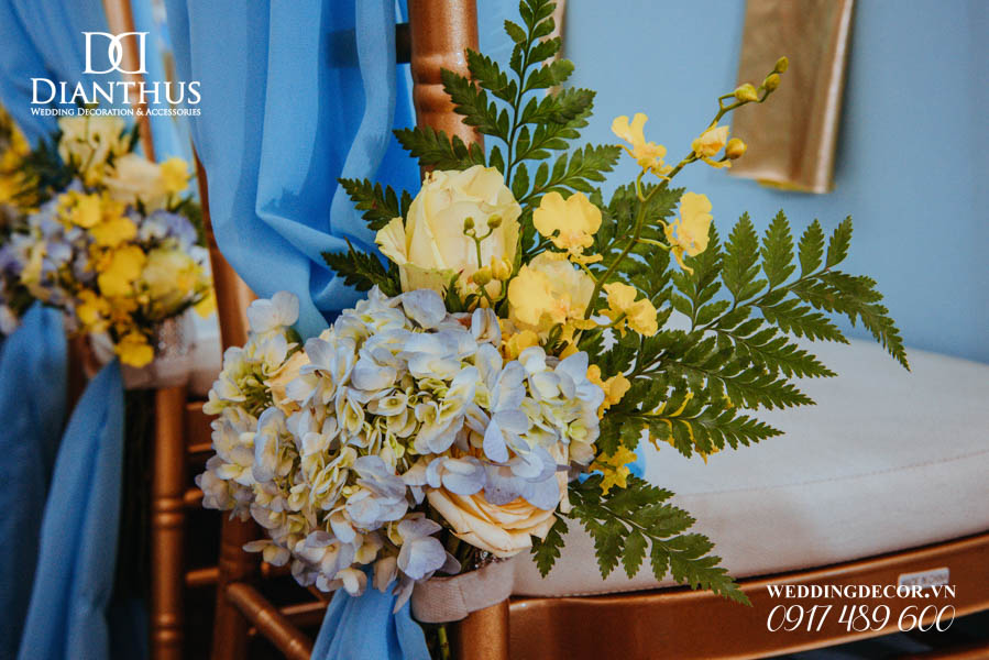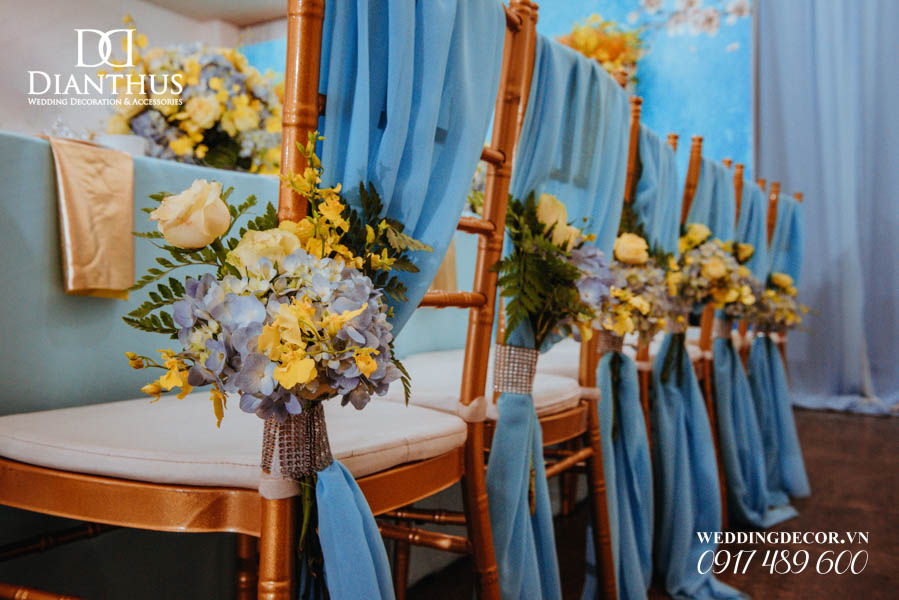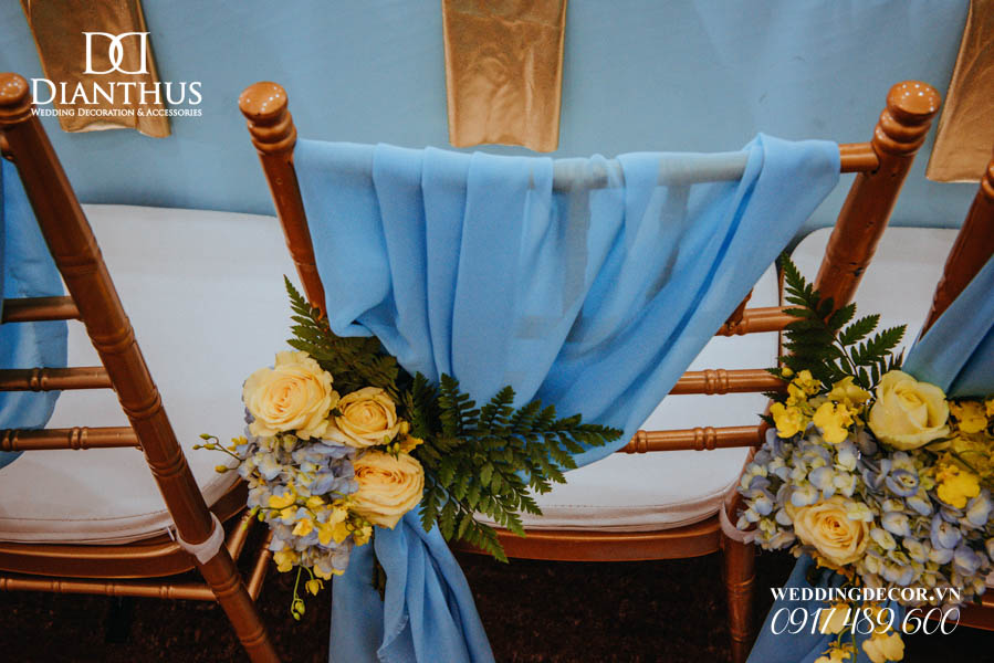 - 12 Ghế dựa/Ghế Tiffany thắt nơ & kèm cụm hoa theo tông màu.