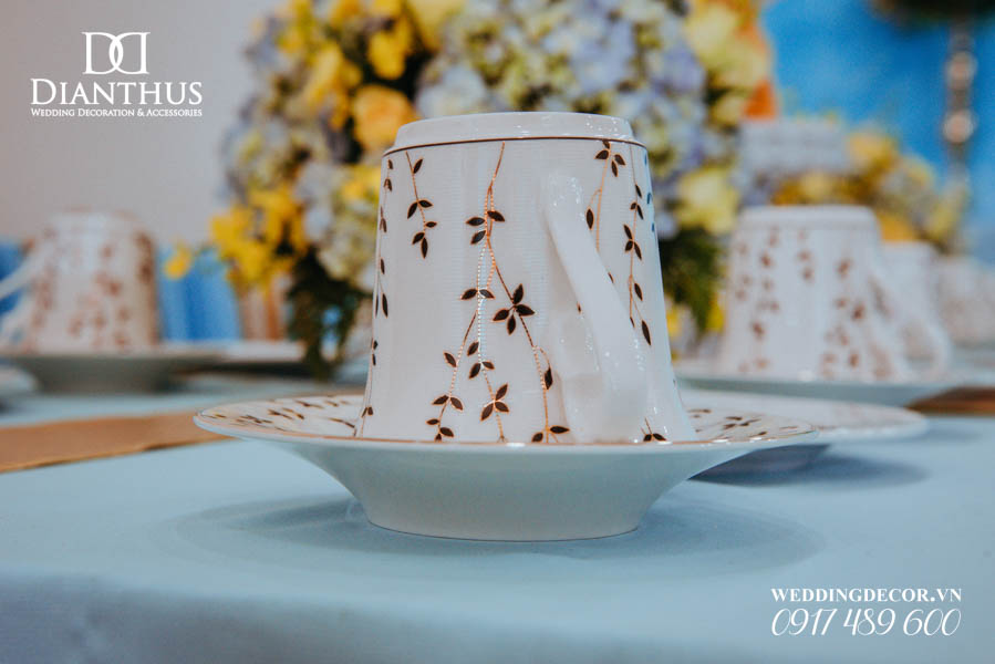 - Bộ ấm tách trà, dĩa lót ly sử dụng là loại gốm sứ Minh Long rất sang trọng.